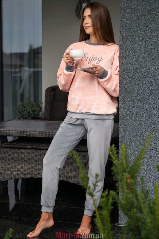 Флисовый комплект 1410 Wiktoria. Комплект состоит из свободной кофты из мягкого пушистого флиса и велюровых брюк на мягкой резинке в поясе. Кофта с круглым вырезом горловины, широкие рукава с пришивными манжетами, по низу пришивной пояс из велюрового материала, декорирована вышивкой на груди. Брюки с манжетами на штанинах. Комплект подходит как для сна, так и для отдыха дома. Состав: кофта (махра флис) – 100% полиэстер, штаны (велюр) - 100% полиэстер.