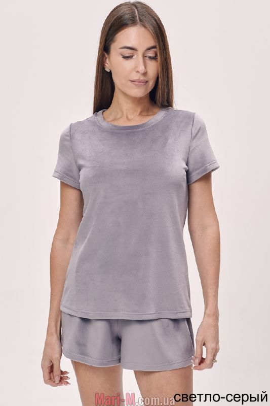 Велюровый комплект 1621 Wiktoria. Пижама выполнена из приятного бархатистого велюрового трикотажного материала. В комплект входит футболка с короткими рукавами и неглубоким круглым вырезом горловины и шорты на мягкой резинке в поясе. Состав: 100% полиэстер.