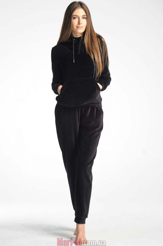 Велюровый комплект для дома из хлопка 909 Wiktoria. Удобный и стильный домашний костюм из приятного велюрового материала. В комплект входит толстовка с капюшоном и карманом-кенгуру и свободные брюки на мягкой резинке в поясе. Капюшон глубокий, со шнурком на кулиске, высокий воротник с застежкой-молнией, по низу толстовки широкий пришивной пояс. Рукава и штанины с пришивными манжетами. Состав: 95% хлопок, 5% эластан.