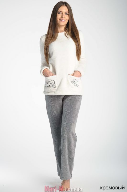 Пижама/домашний комплект из флиса 923 Wiktoria. Теплый и уютный комплект из мягкого пушистого флиса. Состоит из свободной кофты с длинными прямыми рукавами и неглубоким круглым вырезом горловины и свободных прямых брюк на мягкой резинке в поясе. Кофта дополнена накладными карманами, декорированными вышивкой. Комплект подходит как для сна, так и для отдыха дома. Состав: 100% полиэстер.