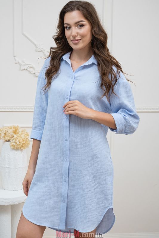 Платье-рубашка из хлопка 1506 Wiktoria. Стильное и удобное домашнее платье из легкого натурального хлопкового полотна. Модель прямого рубашечного кроя, с рукавами ¾ и отложным воротником, застегивается на пуговицы спереди. Рукава с манжетами на пуговицах. Передние полочки и спинка закруглены снизу, образуя вырезы по бокам. На спинке небольшой вырез-капелька. Подходит как для сна, так и для отдыха дома. Состав: 100% хлопок.