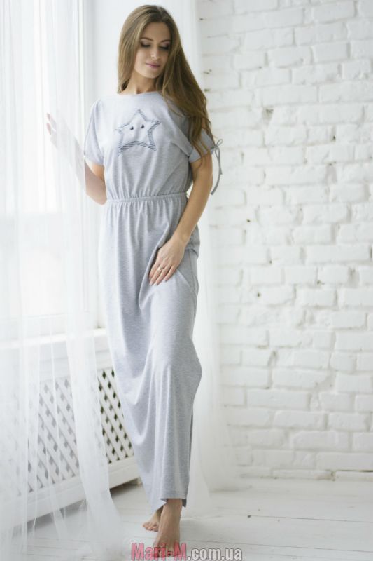 Длинное домашнее платье из хлопка 618 Wiktoria. Удобное домашнее платье макси с короткими рукавами. Выполнено из мягкого трикотажного материала. Модель с вырезами и завязками на рукавах, неглубоким вырезом-лодочкой спереди и V-образным вырезом на спине. В талии мягкая резинка, юбка с разрезами по бокам. На груди платье декорировано принтом в виде звезды. Состав: 95% хлопок, 5% эластан.