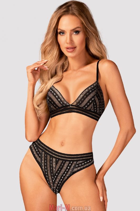 Кружевной комплект Natilya Set Obsessive. Соблазнительный комплект нижнего белья из эластичного сетчатого полотна с серебристым блестящим узором. Бюстгальтер-бралетт с мягкими треугольными чашечками без каркасов. Под грудью широкий ажурный пояс. Тонкие бретели регулируются по длине, на спине многоступенчатая застежка на крючки. Трусики бразилианы с завышенной посадкой дополнены широким ажурным поясом. На пояснице треугольный вырез. Хлопковая ластовица. Состав: 90% полиамид, 10% эластан.