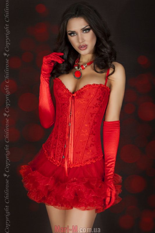 Корсет с узором 3204 CORSET Chilirose. Роскошный корсет выполнен из высококачественного атласного материала, украшенного растительными узорами. Вертикальные косточки моделируют силуэт и визуально стройнят. По линии декольте и по низу корсет отделан рюшами, на спине - шнуровка из атласной ленты, а на груди – такой же бант. Тонкие съемные бретели регулируются по длине. Корсет застегивается спереди на крючки. Комплект включает в себя корсет, стринги и съемные бретели. Юбка и перчатки в комплект не входят. Состав: 65% полиэстер, 25% хлопок, 10% эластан.
