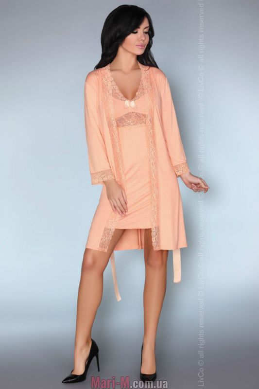 Ночная сорочка и халат из вискозы с кружевом Shirleena Livia Corsetti. Очаровательный комплект в нежном персиковом цвете, состоящий из сорочки и халата. Выполнен из приятного к телу, мягкого материала. Элегантная модель сорочки покоряет классическим дизайном без лишних деталей. Модель без выделенных чашек и косточек, без рукавов, с V-образным вырезом горловины, украшенным атласным бантиком. Полупрозрачные вставки из кружева под грудью и по линии декольте добавляет модели нежности. Халат длиной выше колен, на запах, с широким атласным пояском, длинные рукава и полочки спереди оторочены широким кружевом. В комплект входит только халат и сорочка (трусики в комплект не входят). Состав: 94% вискоза, 6% эластан.