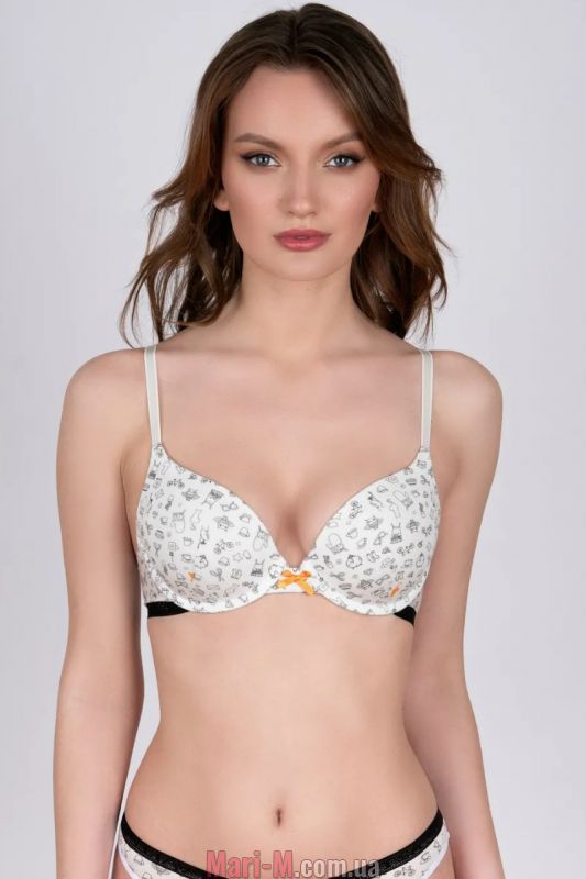 Бюстгальтер push-up 330010 Milavitsa. Выполнен из вискозного трикотажного полотна с легкой графической набивкой. Чашка формованная, push-up не съемный. Бретель не съемная. На костях. Состав: 65% вискоза, 30% полиэстер, 3% эластан, 2% полиамид.