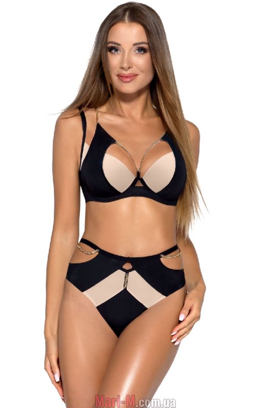 Бюстгальтер push-up Chloe N01 Novika. Стильная и эффектная двухцветная модель оригинального дизайна с декором в виде золотистых цепочек. Гладкие формованные чашки на каркасах с эффектом пуш-ап покрыты микрофиброй бежевого цвета. Сверху чашки дополнены деталью из микрофибры контрастного цвета, которая удерживается золотистыми цепочками в зоне декольте, что придает бюстгальтеру оригинальный вид и приковывает внимание к груди. Спинка гладкая, из функционального плотного сетчатого полотна. Бретели не отстегиваются, регулируются по длине, их ширина зависит от размера. Цепочки на спине переходят в тонкие регулируемые ремешки. На спине трехступенчатая застежка на крючки. Гипоаллергенная фурнитура золотистого цвета прекрасно сочетается с цепочками в зоне декольте. Бюстгальтер на базе конструкции Ava Kopa P-Up с силиконовым наполнителем в чашке формирует соблазнительную линию декольте, придает груди дополнительный объем. Состав: 88% полиамид, 8% хлопок, 4% эластан.
