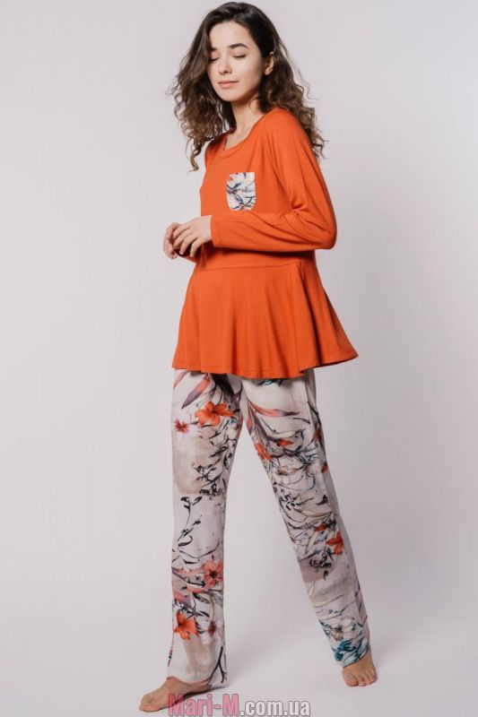 Пижама из вискозы LP 005 Paco Luna. Комплект состоит из кофты припыленно-оранжевого цвета с высоким овальным декольте и контрастных свободных брюк с цветочным принтом на молочном фоне. Кофта украшена декоративным накладным кармашком в тон брюкам. В области талии кофта имеет летящую форму баски (широкая оборка в форме трапеции). Вискозная ткань обеспечивает комфорт и чувство легкости. Состав: 95% вискоза, 5% эластан.