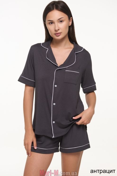 Пижама из вискозы – рубашка и шорты LP 015 Catalina Luna. Классическая пижама из очень мягкого и нежного вискозного трикотажа. В комплект входит рубашка свободного кроя с короткими рукавами и короткие шорты на широкой мягкой резинке в поясе. Рубашка с отложным воротником, застегивается на пуговицы спереди. Декорирована накладным карманом на груди. Пижама отделана узким атласным кантом по краю полочек, на воротнике, рукавах и штанинах. Состав: 97% вискоза, 3% эластан.