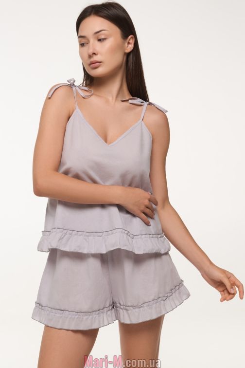 Батистовая пижама LP 017 Fidel Luna. Очень легкая и воздушна летняя пижама из тонкого невесомого хлопкового полотна. В комплект входит майка-топ с V-образным вырезом и свободные шорты на широкой мягкой резинке в поясе. Майка с тонкими бретелями, которые завязываются на плечах. Шорты и майка по низу украшены оборками с отделкой тонким швом микрооверлок. Состав: 100% хлопок (батист).