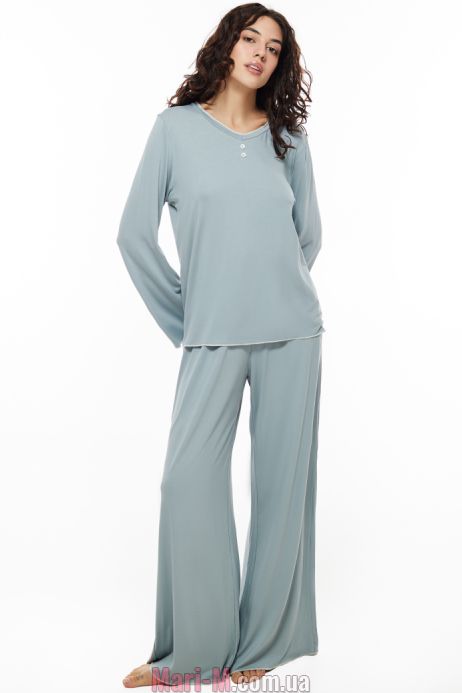 Пижама из вискозы LP 020 Tara Luna. Пижама выполнена из нежного вискозного трикотажа. В комплект входит лонгслив и брюки. Лонгслив свободного кроя, с неглубоким U-образным вырезом горловины, украшенным пуговицами. Брюки свободного кроя, с мягкой комфортной резинкой в поясе. Рукава и штанины расширяются к низу. Вырез горловины, низ полочек, рукавов и штанин отделаны декоративным швом микрооверлок. Состав: 97% вискоза, 3% эластан.