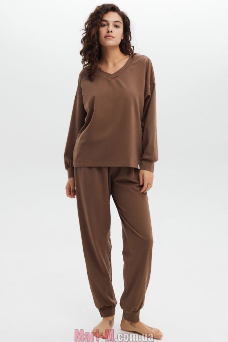 Хлопковая пижама LР/LR 023 Aragon Luna. Пижама выполнена из мягкого и приятного хлопкового трикотажного полотна (кулирка). В комплект входит лонгслив и брюки-джоггеры. Лонгслив свободного кроя, с неглубоким V-образным вырезом горловины, длинные рукава со спущенной плечевой линией. Брюки свободные, с мягкой широкой резинкой. Рукава и штанины с манжетами. Состав: 96% хлопок, 4% эластан.