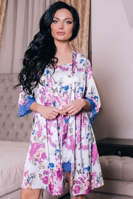 Атласный халат с цветочным принтом и кружевом 1423/1 Shato